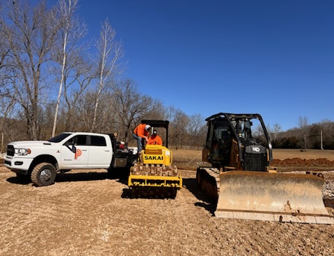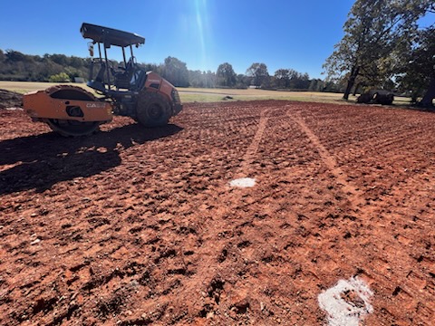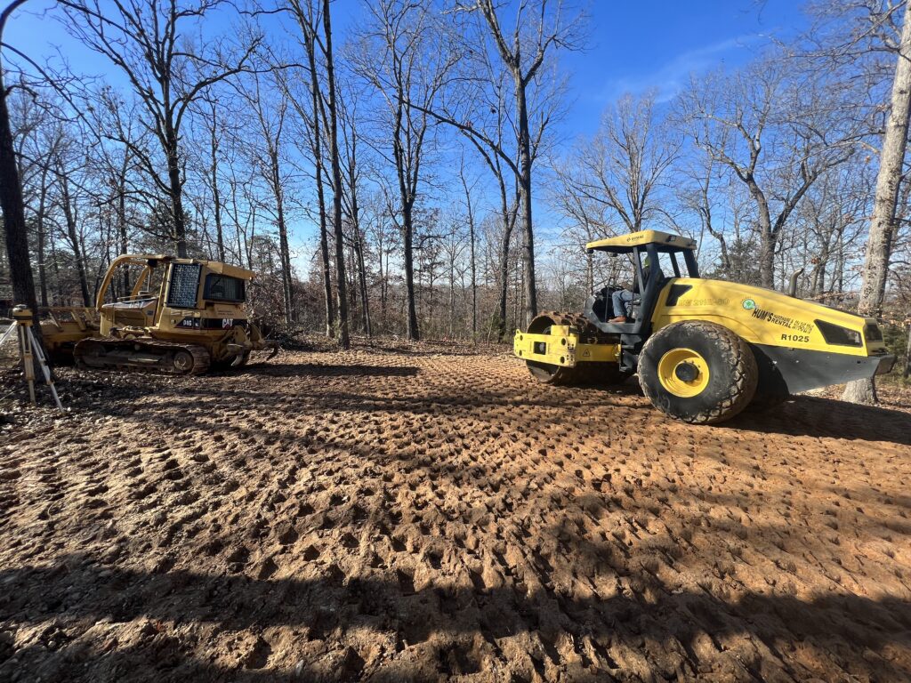For pads we start by removing all organic material off the location until left with a suitable subsoil material. Unless engineered differently, we will decide based on drainage, preference, building features, and type of material on our cut and fill. For select fill we will haul in red clay at proper moisture and compact with a padfoot roller in 6-8” lifts. Depending on builder preference we generally do a 5’ at-grade overbuild on all sides. Entire pad shall be +\- a 1/10th. Slopes will be “mow-able” and at least a 3:1. We generally save the initial scraped organic material to be put back on clay slopes to quickly tie into surrounding landscape during construction. Based on concrete contractor and type of foundation we generally prep the pad with 3/4” base at grade. Pads will be designed to drain water away from the structure and swales, berms, and other drainage may be added if needed.